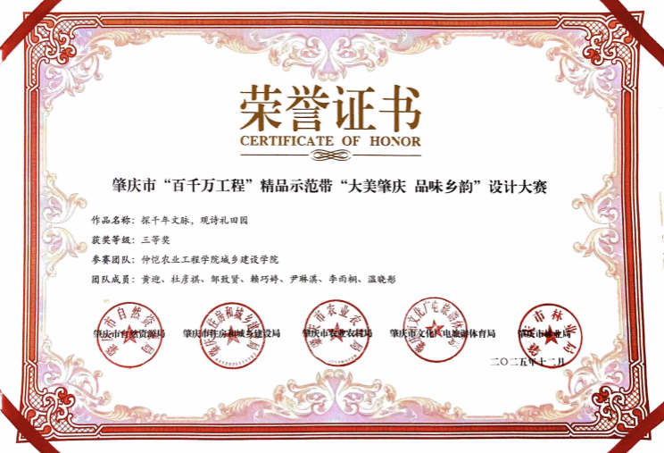 值得一提的是,团队针对前进村完成的典型村乡村规划设计方案,此前已荣获肇庆市“百千万工程”精品示范带“大美肇庆 品味乡韵”设计大赛三等奖。该方案以状元文化为核心,构建“一心两轴三片区”功能布局,打造集文化展示、生态休闲、研学产业联动于一体的特色乡村空间,为渔涝镇典型村建设提供了可落地的示范样本。